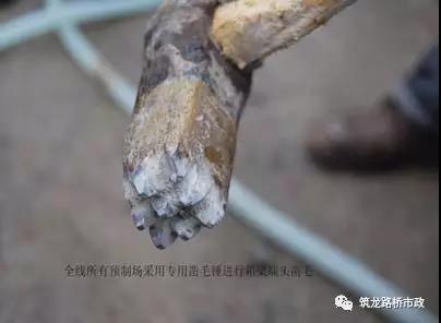 混凝土端面鑿毛凡是濕接縫、梁端等部位,拆模后立即用專用鑿錘或電動(dòng)鑿毛錘進(jìn)行鑿毛。